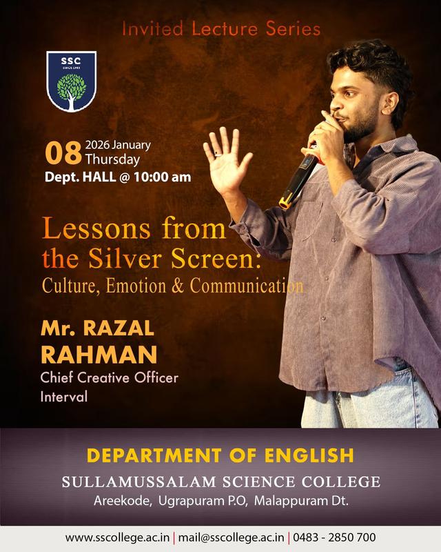 The PG Department of English at Sullamussalam Science College, Areekode, organized an invited talk titled "World of O.V. Vijayan: Poetics, Politics, and Ethics" on 6th November 2024. This session provided an insightful exploration of the works of O.V. Vijayan, one of Kerala’s most celebrated writers, focusing on the intersections of his literary poetics, political ideologies, and ethical concerns.