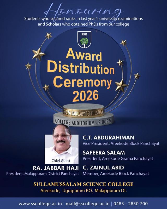 Welcome to Sullamussalam Science College, a beacon of hope and progress in Malabar, dedicated to transforming lives through education, especially for the rural and marginalized. Our journey, rooted in the vision of empowering communities, focuses on intellectual transformation with a global perspective, equipping you not just with degrees, but with character, ethics, and invaluable skills for the future. At SSC, we believe in fostering a dynamic environment where curiosity thrives and innovation flourishes, backed by a dedicated faculty and modern resources. We prepare you to be adaptable, employable, and socially responsible citizens, ready to meet the challenges of a competitive world. As you embark on your academic journey, I urge you to embrace diligence, dedication, and a commitment to excellence. Let us collectively build upon our legacy, turning every day into a step closer to your dreams and contributing to a brighter, more progressive tomorrow.Best wishes for a successful and enriching experience at Sullamussalam Science College!