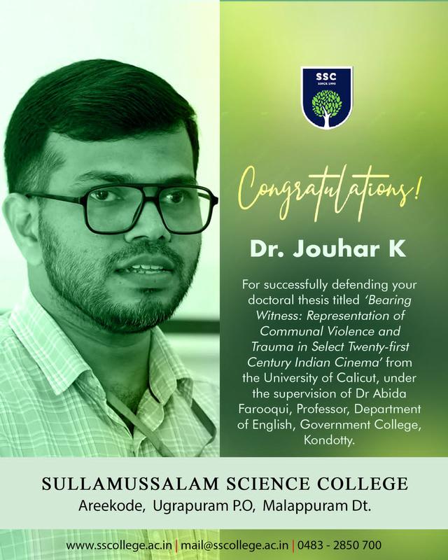 Successfully defended his Ph.D Viva Voce from Research Department of Computer Science, Sullamussalam Science College Areekode affiliated to University of Calicut on the topic A personalised Malayalam travel recommendation model using deep clustering techniques.